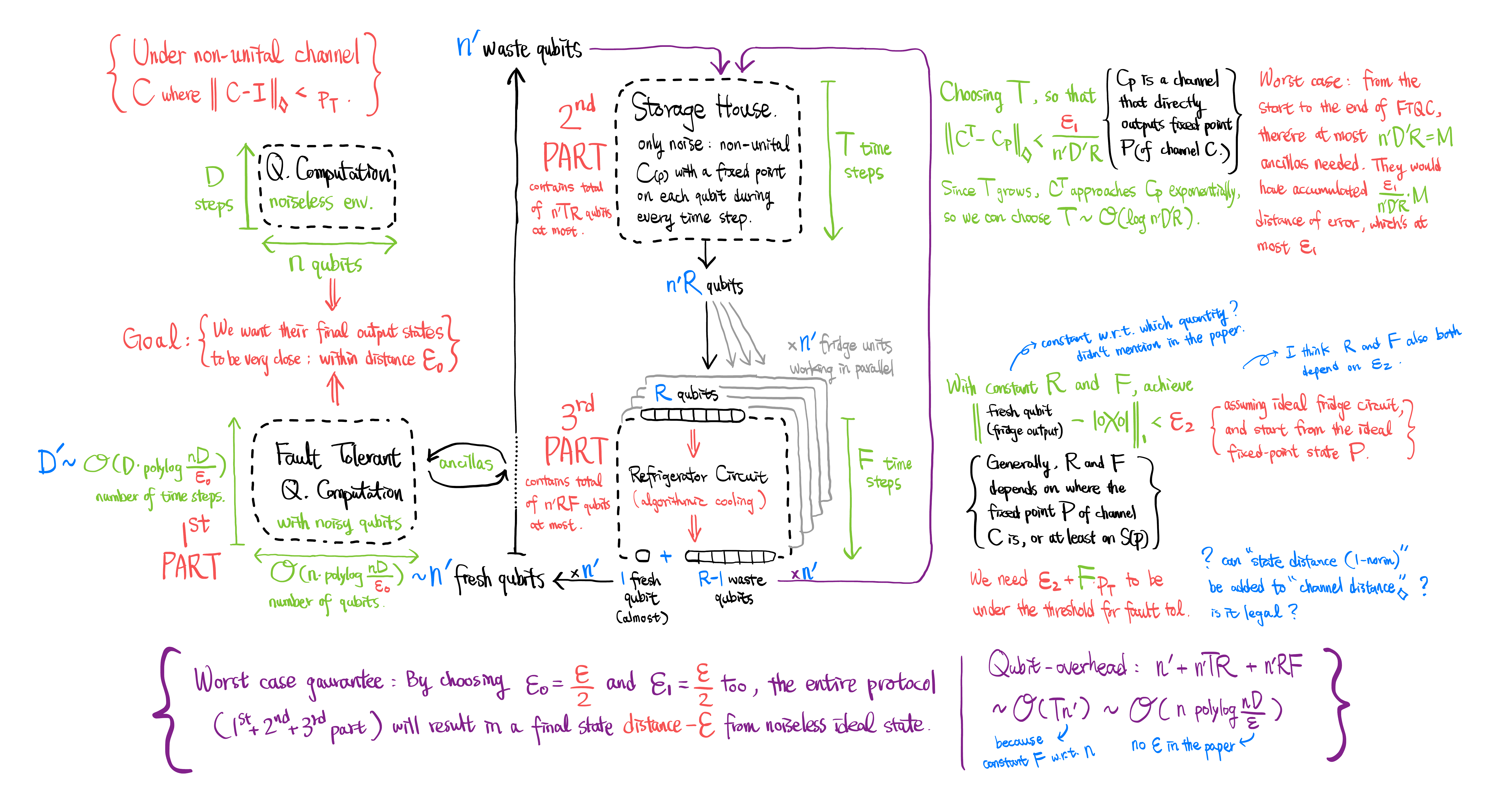 After cooling, each fridge outputs \(\color{blue}{1}\) "fresh" qubit (almost in state \(\ket0\bra0\)), plus \(\color{blue}{R-1}\) "dirty" qubits (almost in maximally mixed state). - \(F\) --> the depth of the fridge's circuit (for cooling purpose).